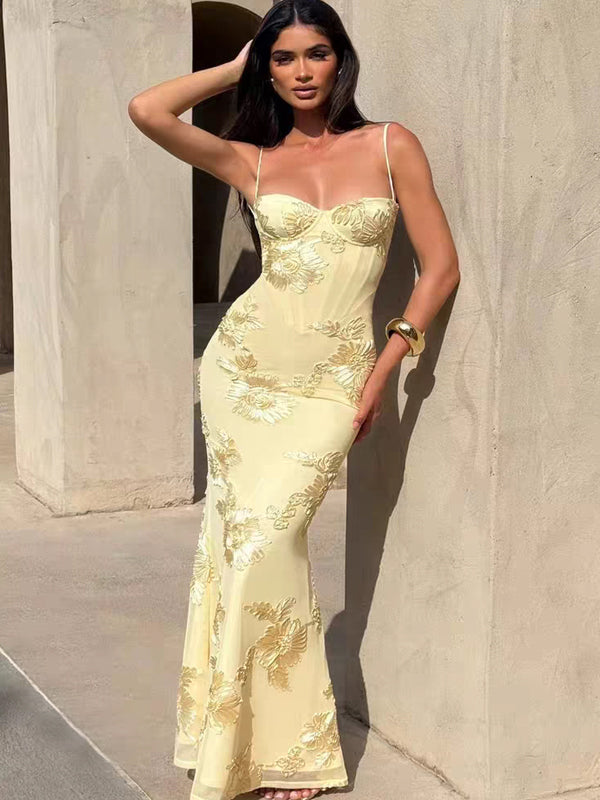 3D Floral Embroidery Tulle Spaghetti Strap Mermaid Yellow Prom Dresses, CP1045