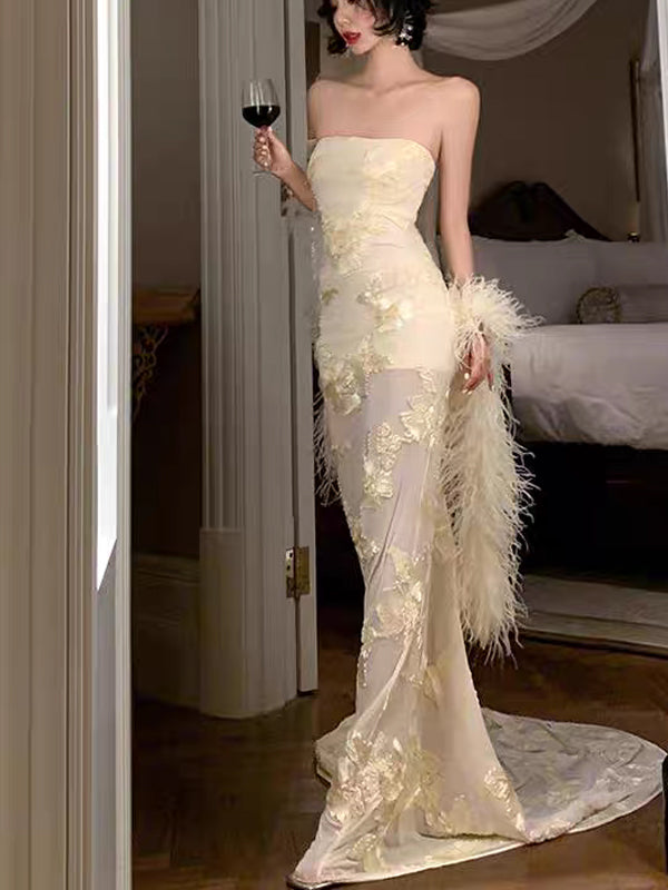 3D Floral Embroidery Tulle Strapless Mermaid Yellow Prom Dresses, CP1047