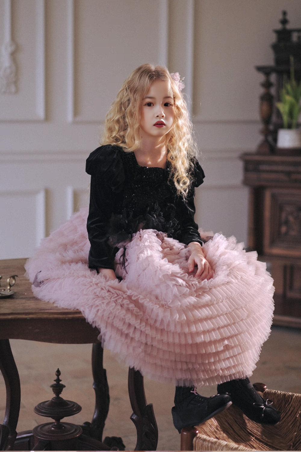 Black Sequin Bustier with Fluffy Shoulders and Feather-Trimmed Pink Layered Tulle Skirt Flower Girl Dress, CF0019