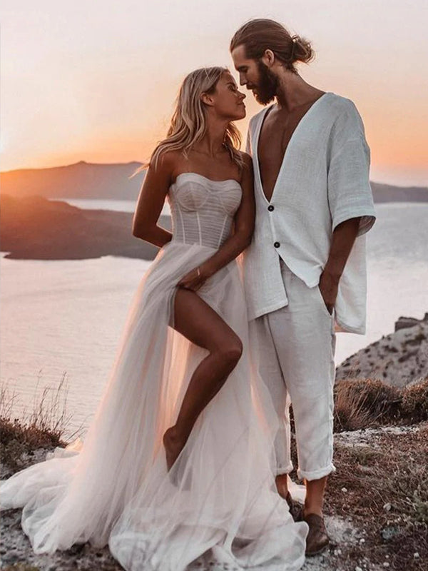 Light Pink Tulle Pleating Strapless A-line High Slit Beach Wedding Dresses, CW0426
