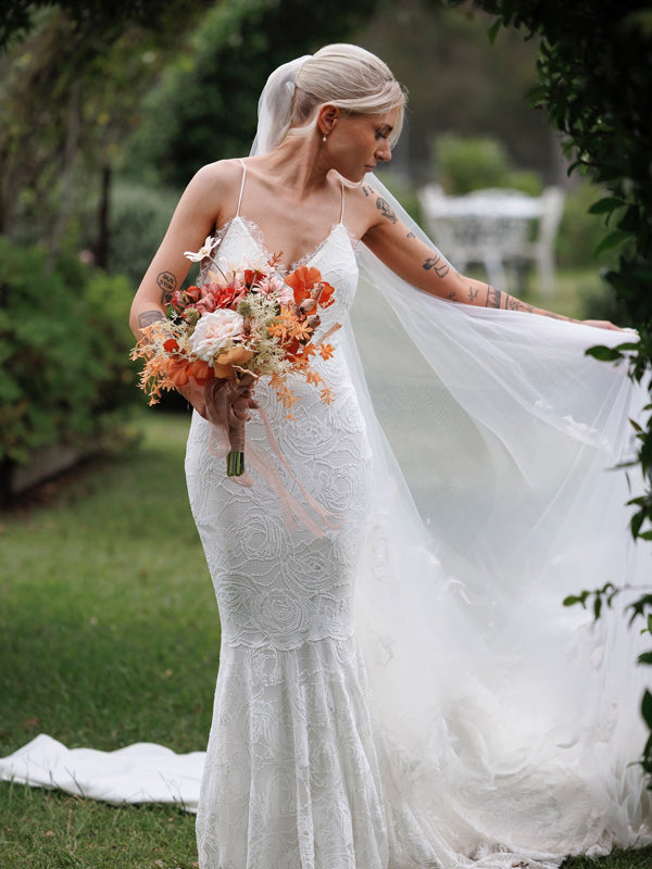 Rosy Lace Spaghetti Strap V-neck Mermaid Backless Wedding Dresses, CW0429