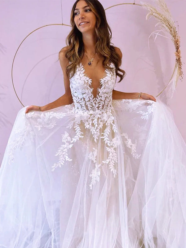 Shiny Beaded Lace Applique Glitter Tulle V-neck Sleeveless A-line Wedding Dresses, CW0428