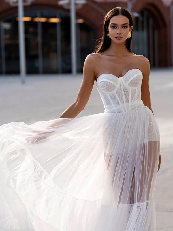 White Sheer Tulle Sweetheart Strapless A-line Fashion Wedding Dresses, CW0420