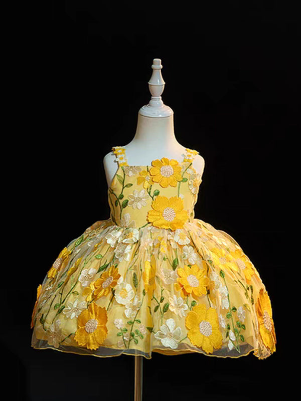 Yellow Floral Embroidery Sleeveless Short Flower Girl Dresses Birthday Dresses, CF0017